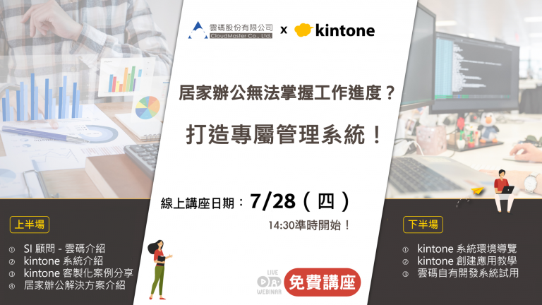 Post published:2022-06-27 【報名截止】雲端服務,低成本打造專屬於公司的管理系統 - kintone線上講座 因為疫情開啟分流上班、居家辦公,覺得難以掌握員工們、部下們的工作進度?正在考慮導入一套系統來管理,但購買既有的套裝系統太過昂貴且導入時期太長?不用再妥協於套版系統!使用 kintone,將其打造成完全貼合公司使用的系統。雲碼將在 7/28(四)下午舉辦免費的 kintone 線上講座,帶大家全面了解 kintone 的系統建構、操作模式以及各種延伸使用的可能性! 免費報名(已截止) 講座資訊:✦ 時間:2022/7/28(四)14:30~16:30 (14:20開放進場)✦ 地點:線上舉辦(線上會議連結將直接發送至報名信箱)✦ 講座內容:詳細介紹 kintone 功能、系統建置與使用方法,後半場由工程師帶領大家直接使用 kintone。✦ 講座後半場有實際使用與系統建置教學,kintone 是一套簡單上手的系統,不管是IT人員或是行政人員皆推薦參加! 講座詳細介紹 免費報名(已截止) 備註事項: 本次線上講座使用zoom線上會議舉行,線上會議連結與操作環境連結請至報名信箱中確認。 ↓若您無法參加此次講座,歡迎直接聯絡雲碼,將會有專人與您聯繫一對一介紹。↓Email:Rep@CloudMaster.com.tw電話:(02)2311-8191填表諮詢:https://www.cloudmaster.com.tw/contact/contact_us/kintone專欄:https://www.cloudmaster.com.tw/category/kintone/ 免費報名(已截止)